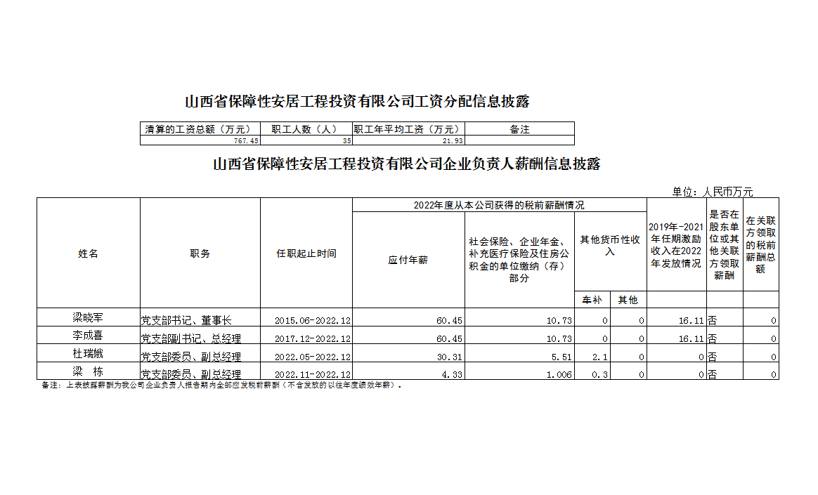 山西省保障性安居工程投資有限公司2022年度工資分配信息、企業(yè)負責人薪酬信息公示